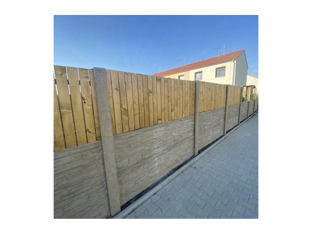 Základní stavební element plotu. Používá se po celé délce jako výplň v betonovém oplocení. Může být kombinována s ukončovací horní deskou (oblouk, poloprůhledná mřížka). Z jedné strany je vzor štípaného kamene, z druhé strany je hladká. Betonové desky lze kombinovat až do výšky 250cm ( 5 desek ). Výhodou je dlouhá životnost, estetický vzhled a bezúdržbovost!
